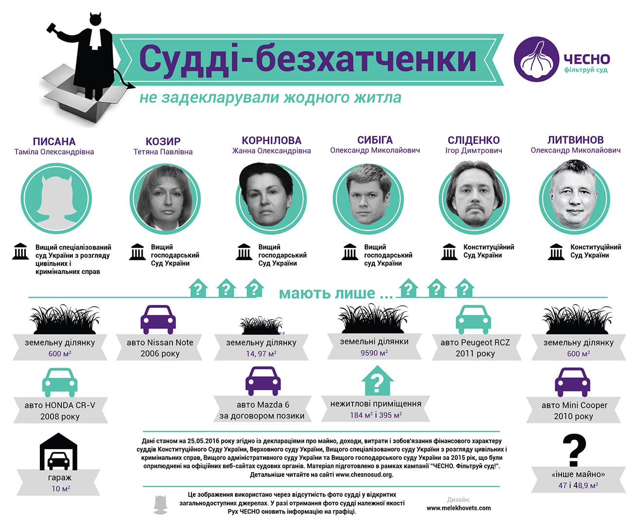 Также Честно выявило в высших судах пять бездомных судей, которые не задекларировали ни одного квадратного метра жилой площади в собственности всей семьи.