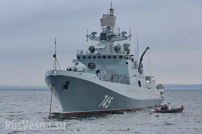 Как сказано в аннотации к видео, фрегат стоимостью примерно в 500 миллионов долларов только сегодня поступил на службу Черноморского флота.