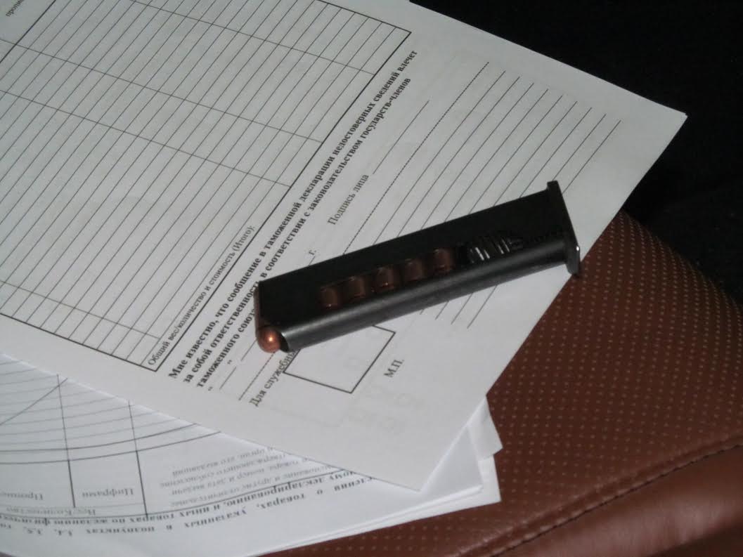 Во время устного и письменного декларирования пассажиров автомобиля, следовавшего через пункт пропуска, никто не заявил о наличии предметов, ограниченных или запрещенных к перемещению. Но, в результате осмотра, в «бардачке» транспортного средства, без признаков сокрытия от таможенного контроля был обнаружен магазин с 7 патронами из металла желтого цвета, с маркировкой на гильзе «38 78», похожими на боевые.