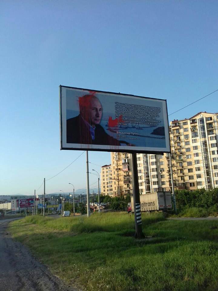 В оккупированном Симферополе неизвестные залили красной краской билборд с изображением президента России Владимира Путина.