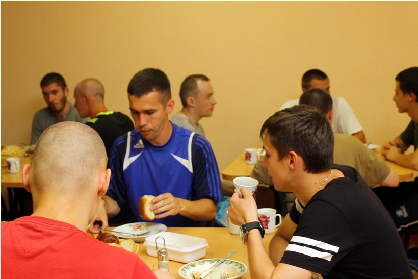 В столовой молодые бойцы могли сравнить домашнюю кухню с армейской - вместе с солдатской кашей они ужинали тем, что в дорогу им передали заботливые матери.