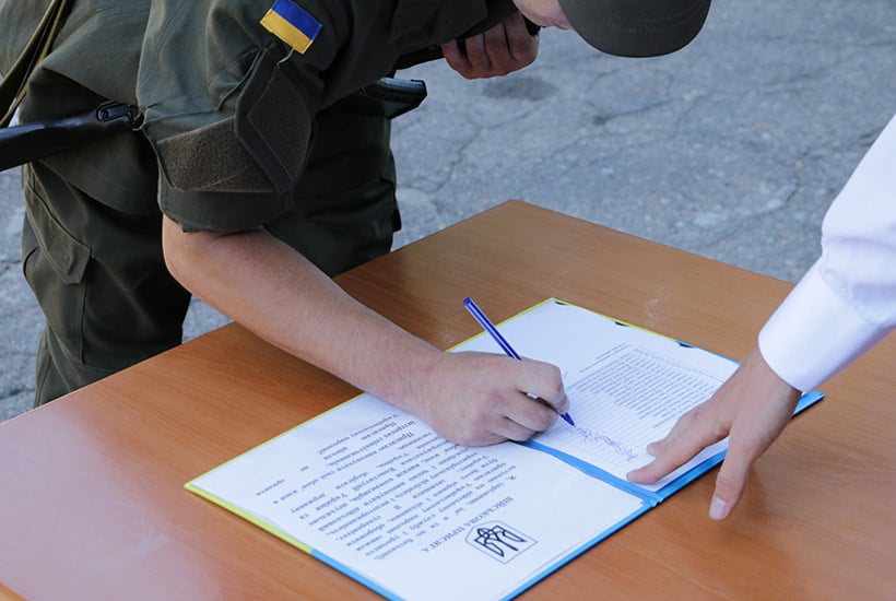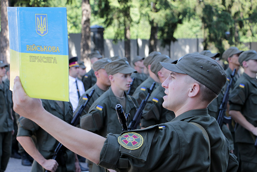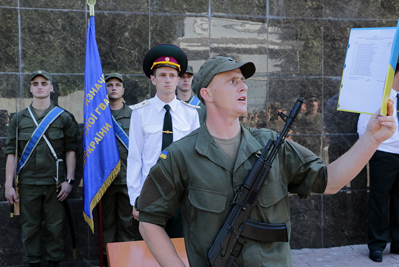 Клятву на верность народу Украины дают только те бойцы, кого после тщательных изучений документов, прохождения психологических тестов и т.д. отобрали для службы в НГУ. Напомним, ни одного юношу, который заявил о том, что в ходе призывной компании был отловлен на улице сотрудниками военкоматов и отправлен на службу угрозами и запугиваиями, в ряды НГУ не примут.