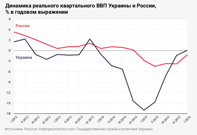 В последнее время украинская экономика показывала лучшую динамику, чем российская, следует из официальной статистики двух стран. В четвертом квартале 2015 года ВВП Украины упал не так глубоко, как ВВП России, а в первом квартале 2016-го даже немного вырос на фоне падения российского показателя. В нынешнем году экономика России сократится на 0,2%, полагают в Минэкономразвития РФ. Всемирный банк более пессимистичен и прогнозирует спад на 1,2%. В то же время от Украины он ожидает роста на 1% – столько же, сколько украинское Министерство экономического развития и торговли.