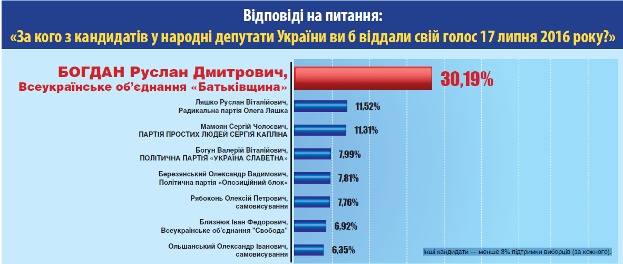 Среди тех, кто определился, за кого голосовать: за Руслана Богдана (ВО "Батькивщина") отдали бы голоса 30,19% избирателей, Руслана Ляшко ("Радикальная партия") - 11,52%, за Сергея Мамояна ("Партия простых людей") - 11,31%, за Валерия Богуна (партия "Украина Знаменитая") - 7,99%, за Александра Березянского ("Оппозиционный блок") - 7,81%, за Алексея Рябоконя (самовыдвиженец) - 7,76%, за Ивана Близнюка (ВО "Свобода") - 6,92%, Александра Ольшанского (самовыдвижение) - 6,35%. Другие кандидаты - менее 3% поддержки избирателей (за каждого).