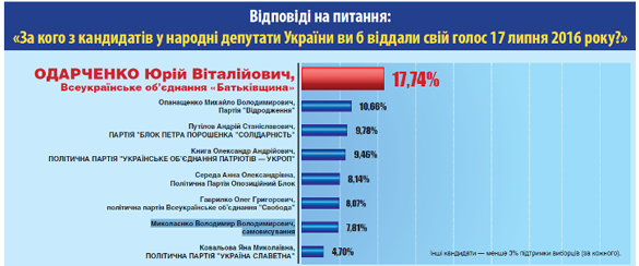 Среди тех, кто определился, за кого голосовать: за Юрия Одарченко (ВО "Батькивщина") отдали бы голоса 17,74% избирателей, за Михаила Опанащенко (партия "Возрождение") - 10,66%, за Андрея Путилова ("Блок Петра Порошенко") - 9,78%, за Александра Книгу ("УКРОП") - 9,46%, за Анну Среду ("Оппозиционный блок") - 8,14%, за Олега Гаврилка (ВО "Свобода") - 8,07%, за Владимира Николаенко (самовыдвиженец) - 7,81%, за Яну Ковалеву ("Украина Знаменитая") - 4,7%. Другие кандидаты - менее 3% поддержки избирателей (за каждого).