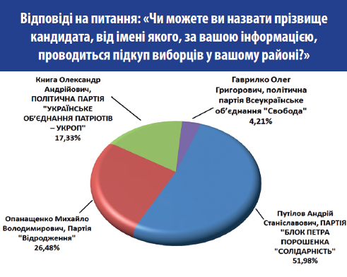 По кандидатам, которые, по мнению опрошенных, занимаются подкупом избирателей, больше всего респондентов - 59,07% - назвали кандидата от "Блока Петра Порошенко" Андрея Путилова - 51,98%, от партии "Возрождение" Михаила Опанащенко - 26,48%, Александра Книгу от "УКРОП" - 17,33% и Олега Гаврилка от ВО "Свобода" - 4,21%.