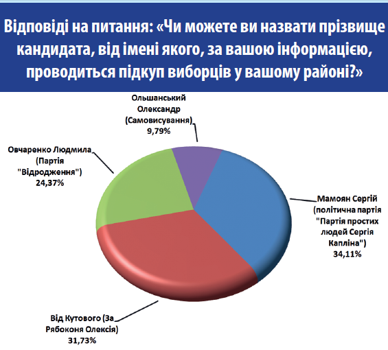 По кандидатам, которые, по мнению опрошенных, занимаются подкупом избирателей, больше всего респондентов - 34,11% - назвали имя Сергея Мамояна ("Партия простых людей"). О фактах подкупа в пользу самовыдвиженца Алексея Рябоконя вспоминали 31,73% респондентов. На третьем месте по количеству упоминаний - 24,39% - оказалась фамилия Людмилы Овчаренко (партия "Возрождение"), на четвертом - фамилия самовыдвиженца Александра Ольшанского - 9,79%.