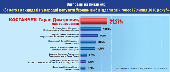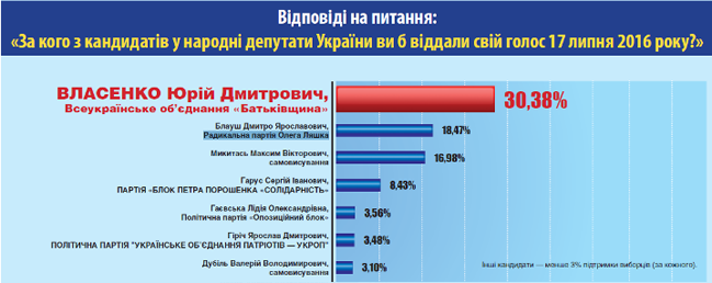 Среди тех, кто определился, за кого голосовать: за Юрия Власенко (ВО "Батькивщина") отдали бы голоса 30,38% избирателей, за Дмитрия Блауша ("Радикальная партия") - 18,47%, за Максима Микитась (самовыдвиженец) - 16,98%, за Сергея Гаруса ("Блок Петра Порошенко") - 8,43%, за Лидию Гаевскую ("Оппозиционный блок") - 3,56%, за Ярослава Гирича ("УКРОП") - 3,48%, за Валерия Дубиля (самовыдвиженец) -3,10%. Другие кандидаты - менее 3% поддержки избирателей (за каждого).
