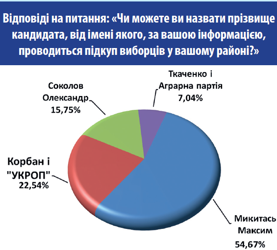 По кандидатам, которые, по мнению опрошенных, занимаются подкупом избирателей, больше всего респондентов - 54,67% - назвали фамилию самовыдвиженца Максима Микитася. На втором месте по количеству упоминаний Геннадий Корбан и "УКРОП" - 20,77%. Самовыдвиженец Александр Соколов - 15,75% и "Аграрная партия" и Ткаченко - 4,84% упоминаний.