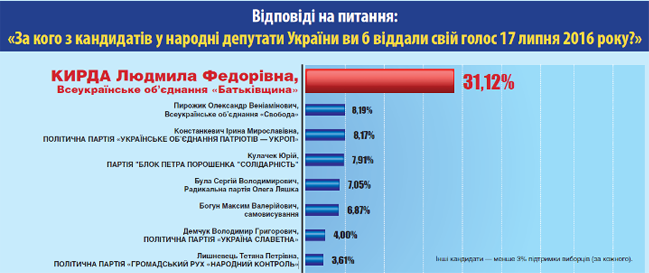 Среди тех, кто определился, за кого голосовать: за Людмилу Кирду (ВО "Батькивщина") отдали бы голоса 31,12% избирателей, за Александра Пирожика (ВО "Свобода") - 8,19% Ирину Констанкевич ("УКРОП") - 8,17%, за Юрия Кулачек ("Блок Петра Порошенко") - 7,91%, за Сергея Булу ("Радикальная партия") - 7,05%, Максима Богуна (самовыдвиженец) - 6,87%, за Владимира Демчука ("Украина знаменитая") - 4%, за Тетяну Лишневець ("Народный контроль") - 3,61%. Другие кандидаты - менее 3% поддержки избирателей (за каждого).