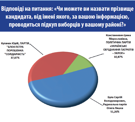 По кандидатам, которые, по мнению опрошенных, занимаются подкупом избирателей, больше всего респондентов - 51,26% - назвали фамилию кандидата от "Радикальной партии" Сергея Булы, выдвиженца от "Блока Петра Порошенко" Юрия Кулачек - 37,87% и Ирину Констанкевич от "УКРОП" - 10,87%.