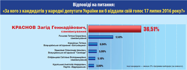 Среди тех, кто определился, за кого голосовать: за Загида Краснова (самовыдвиженец) отдали бы голоса 36,51% избирателей, за Татьяну Рычкову (самовыдвиженец) - 17,41%, за Татьяну Корнийчук (ВО "Батькивщина") - 6,04 %, за Александра Замкового (ВО "Свобода") - 5,99%, за Светлану Епифанцеву (самовыдвиженец) - 5,14%, за Анатолия Крупского (партия "Возрождение") - 3,8%. Другие кандидаты - менее 3% поддержки избирателей (за каждого).