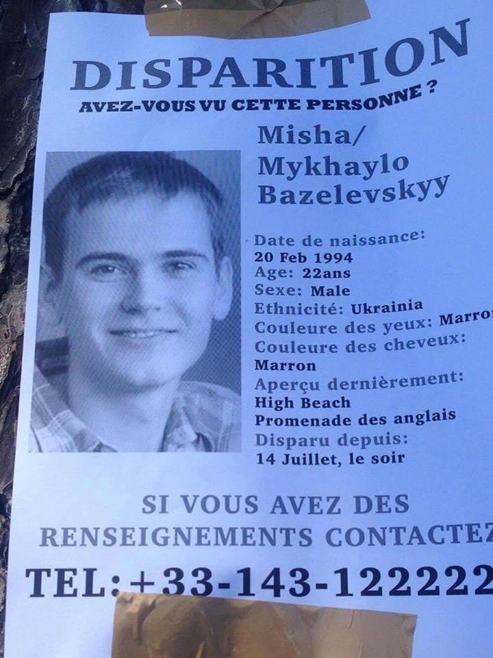 Фотографии Базелевского о розыске в настоящий момент развешены вдоль Английской набережной, где вечером 14 июля во время празднования Дня взятия Бастилии произошла трагедия.