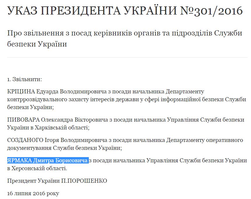 Президент Украины также освободил от должности начальника Управления СБУ в Херсонской области Дмитрия Ярмака.