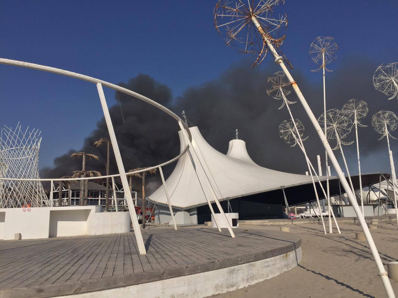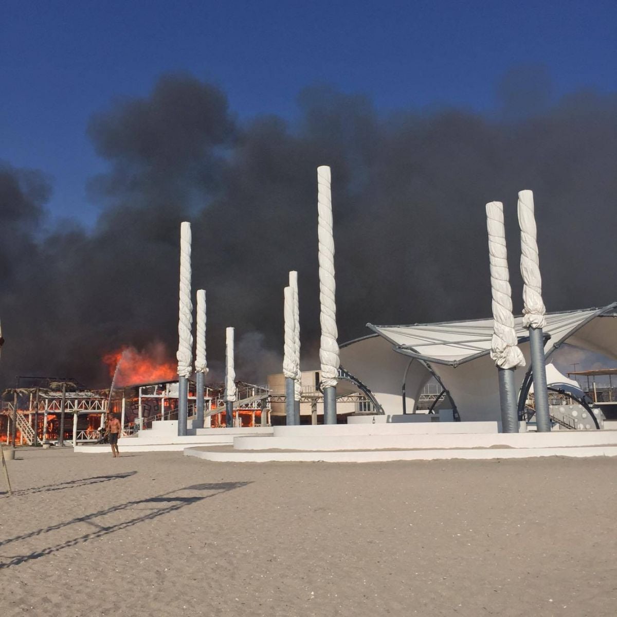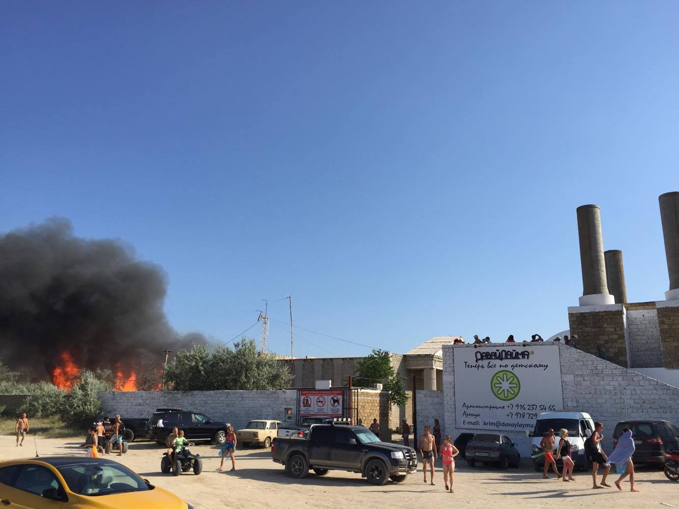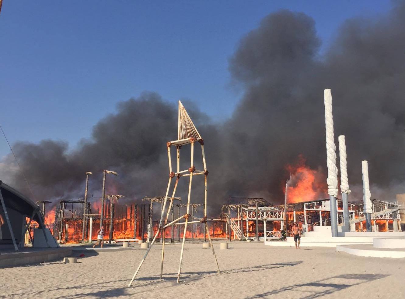 Горят постройки из дерева. Над пляжем видны черные клубы дыма. Люди, которые отдыхали на территории, покинули пляж. С огнем борются спасатели.