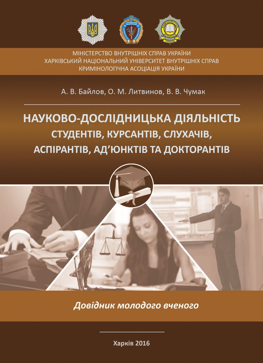 Вышел справочник молодого ученого «Научно-исследовательская деятельность студентов, курсантов, слушателей, аспирантов, адъюнктов и докторантов», подготовленный доктором юридических наук, профессором Алексеем Литвиновым, кандидатом юридических наук, доцентом Антоном Байловым, кандидатом юридических наук Владимиром Чумаком, под общей редакцией доктора юридических наук, профессора Александра Головка. В справочнике изложены порядок организации научно-исследовательской деятельности курсантов, студентов, слушателей, аспирантов, адъюнктов и докторантов, разработанный на основе действующего законодательства и нормативно-правовых актов Министерства образования и науки Украины, а также Министерства внутренних дел Украины. Даны методические рекомендации по выполнению отдельных видов научных, учебно-исследовательских, диссертационных и других работ, рекомендации по их написанию и защите, а также приведены требования к ним. Рассмотрены роль науки и научных исследований в современном мире, вопросы технологии выполнения этих видов работ курсантами, студентами, слушателями, аспирантами, адъюнктами и докторантами. Издание рассчитано на курсантов, студентов, аспирантов, адъюнктов, докторантов высших учебных заведений Украины и всех, кто интересуется основами научно-исследовательской работы.