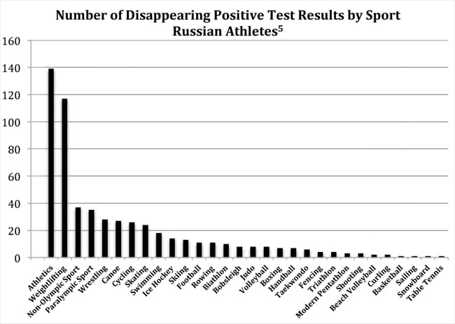 Больше всего сокрытых допинг проб было обнаружено в легкой атлетике — 139. Далее идет тяжелая атлетика (117 проб), затем — неолимпийские виды спорта (37) и паралимпийские дисциплины (35). В хоккее было сокрыто 14 положительных допинг проб, в футболе — 11.