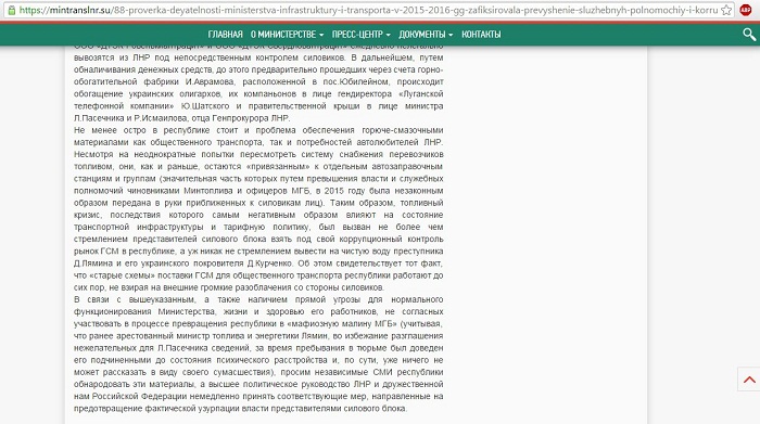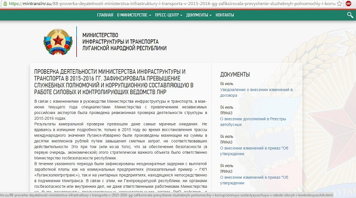 Ранее на сайте «министерства» инфраструктуры «ЛНР» была опубликована информация о том, что силовики «МГБ ЛНР» «крышуют» рынок топлива, незаконный вывоз угля и воруют деньги на ремонте дорог.