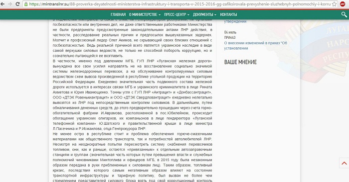 "20.07.2016 в 10 утра был взломан ряд информационных и государственных сайтов Луганской народной республики, в том числе официальный сайт Министерства инфраструктуры и транспорта ЛНР", - приводит сообщение террористов российский "Интерфакс".