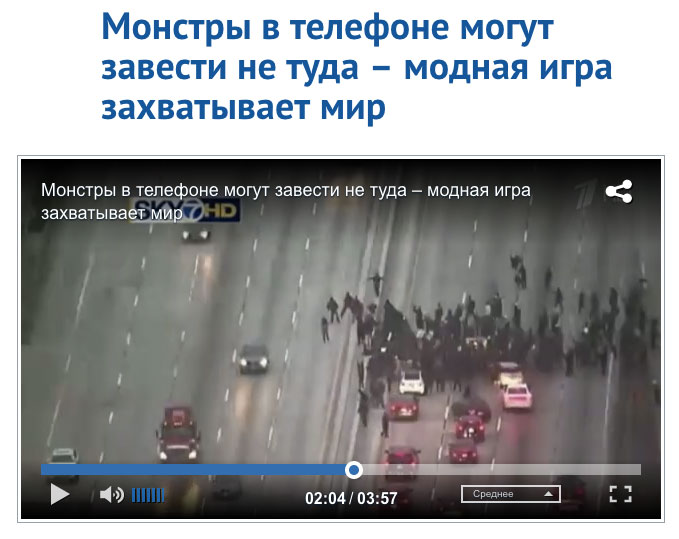 Автор репортажа приводит случаи, когда игроки в Pokemon GO забывают о собственной безопасности ради ловли карманных монстров. В подтверждение были продемонстрированы кадры, на которых толпа выходит на трассу и блокирует движение. «На этом видео ловцы покемонов гурьбой бросаются на оживленную трассу, так что машины едва успевают затормозить», — комментирует видео корреспондент.