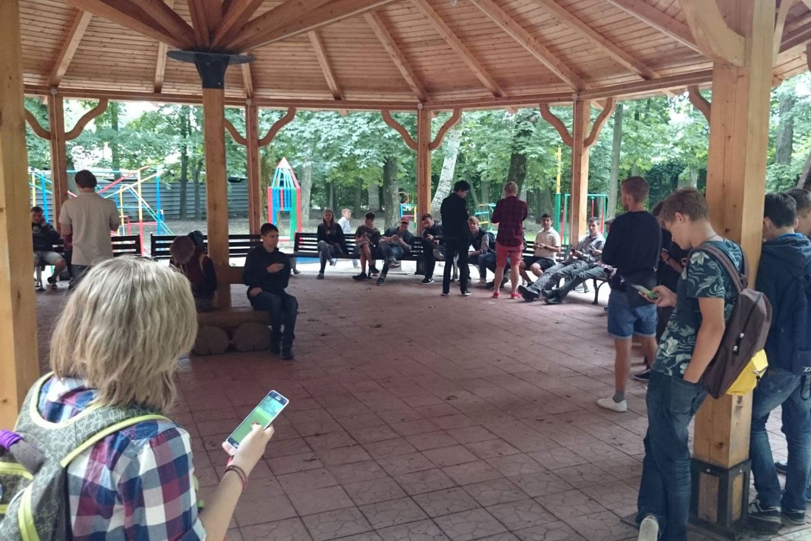 Автор поста отметил, что в этом месте собираются фанаты игры. "Сегодня утром на площадке возле Каразина собрались уже с полсотни человек. Дождь накрапывает, народ под навесом - развлекаются. Но, присесть негде - лавочек нет. А рядом, метрах в трехстах - электрокары катаются. Готовят парк к реконструкции. Развозят стройматериалы и вывозят скамейки с центральной аллеи. За старшего - Анатолий Кандауров, бывший директор КП "Горлифт" и советник мэра", - написал журналист.