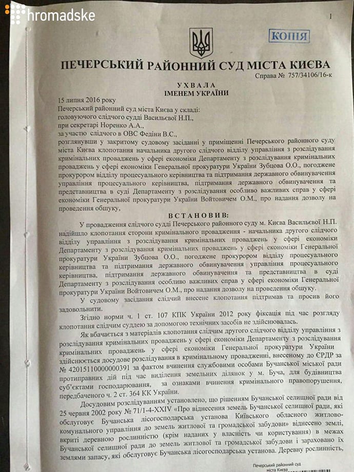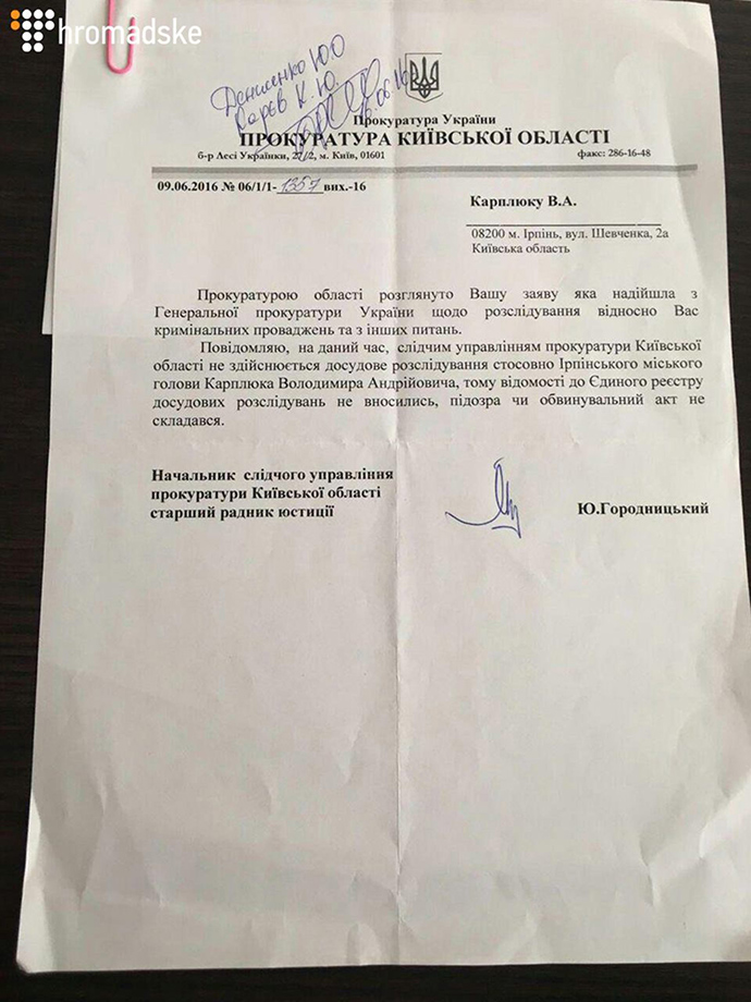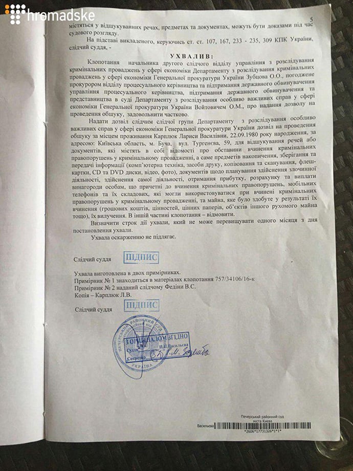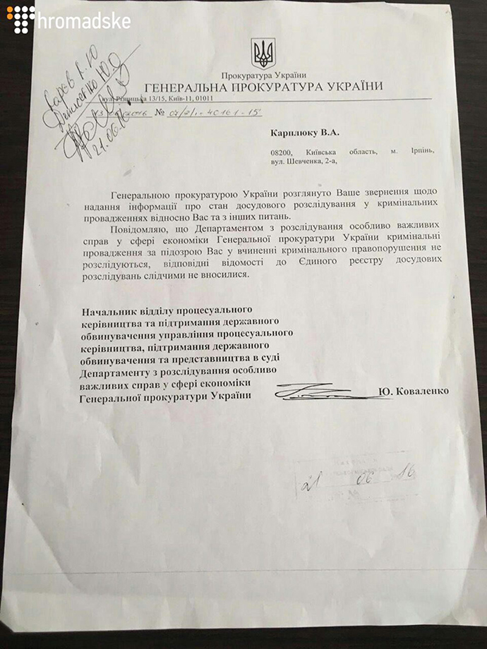 Карплюк предоставил "Громадському" документы, на основании которых были проведены обыски и документы, которые свидетельствуют, что против него нет ни одного уголовного производства.