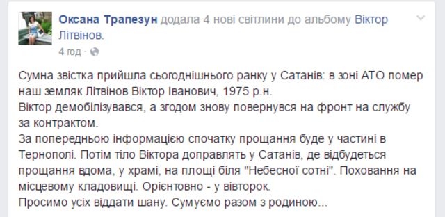 В зоне АТО умер контрактник из Сатанова (фото) 25 июля 2016 08:58 Об этом сообщила жена раненого бойца Сергея Трапезуна, Оксана.