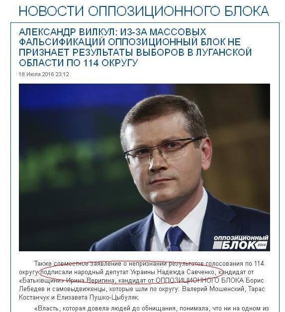 Заявление с требованием повторных выборов вместе с регионалами подписали народный депутат от «Батькивщины» Надежда Савченко (!) и упоминавшаяся Ирина Веригина. Нардеп от «Батькивщины» Алексей Рябчин заявил, что «таких фальсификаций, как на 114 округе, Украина еще не видела».