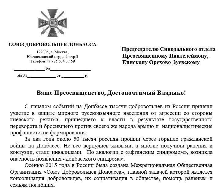 В частности, Бородай в своем письме председателю Синодального отдела Преосвященному Пантелеймону, епископу Орехово-Зуевскому просит Русскую Православную Церковь помочь раненым российским "добровольцам" и семьям погибших россиян, которые воевали на Донбассе на стороне боевиков.