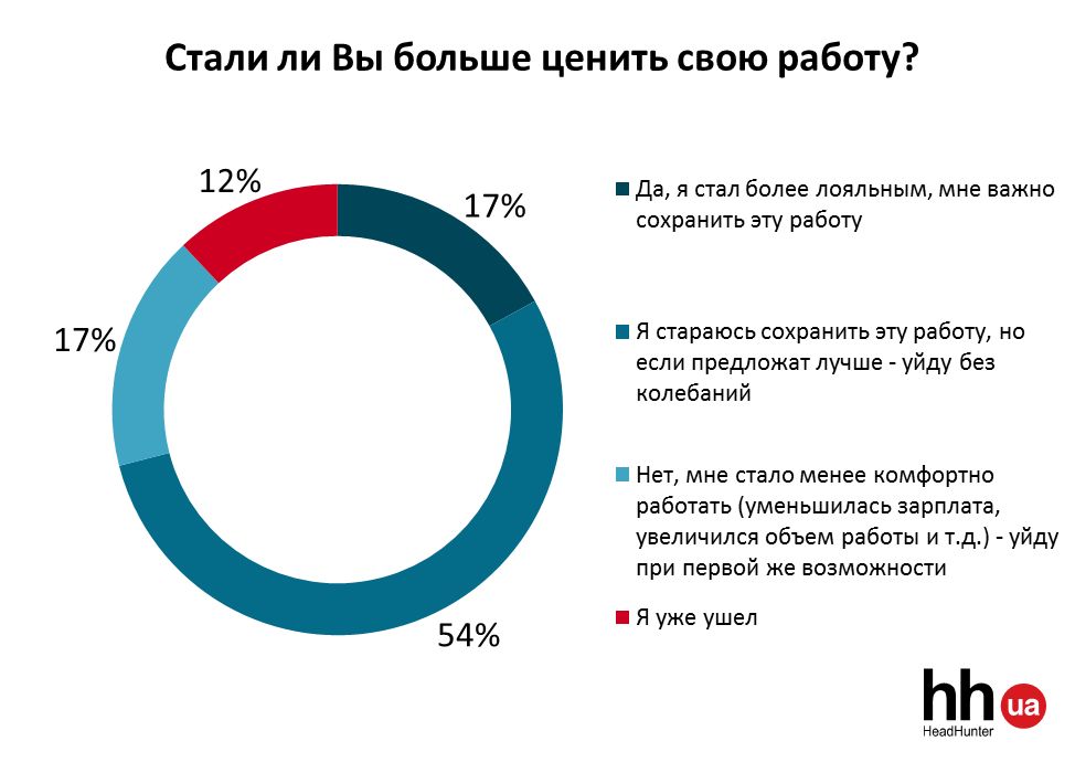 Согласно данным опроса hh.ua, за прошедшие полгода каждый шестой стал более лояльным к работодателю. В первую очередь речь идет об IT-специалистах и работниках консалтинговых компаний, которые предоставляют услуги бизнесу. Остальные занимают двойственную позицию. С одной стороны, хотят сохранить свое рабочее место, с другой, готовы рассматривать предложения работы от других компаний. При этом каждого шестого к таким мыслям подталкивают реальные шаги со стороны работодателя – увеличение нагрузки, снижение заработной платы и т.д. Также стоит отметить, что восьмая часть опрошенных уже уволились по собственному желанию, а это в два раза больше, чем полгода назад.Увеличение объемов работы на себе ощутили больше половины «белых воротничков». Практически у каждого пятого нагрузка увеличилась вследствие роста количества заказов. Эти данные подтверждаются результатами опроса работодателей, согласно которым 20% из них наблюдали активное развитие компании в первом полугодии 2016 года.