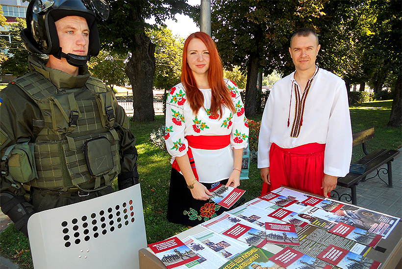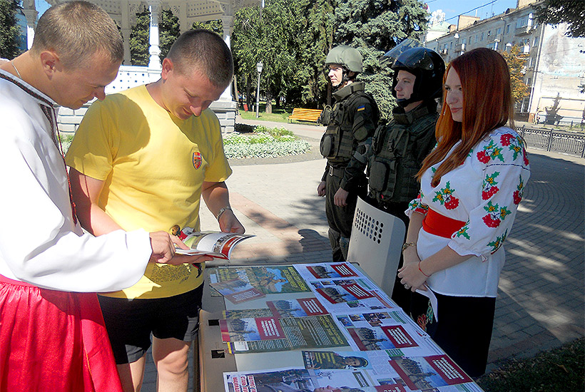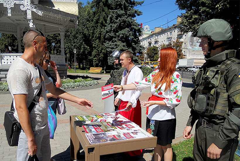 Стоит отметить, что гвардейцы провели нестандартную агитационную работу с населением. Надев традиционные украинские костюмы, они приглашали людей попробовать себя в качестве нацгвардейцев. Таким образом ребята и девушки попытались напомнить всем прохожим о славном историческом прошлом нашей страны и призвать стать на ее защиту сейчас – в один из самых тяжелых моментов в современной истории нашего государства.