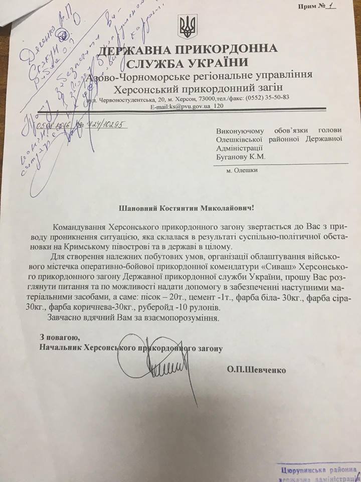 Как стало известно журналистам Херсонщины за день, к машине с КП «Чонгар» направился отряд пограничников, который обратился к представителям Цюрупинской РГА за помощью – им необходимо укрепить свои позиции мешками с песком. Также как стало известно, представители РГА обратились к предприятию «Восход» и его руководителю Виктору Пунгину в содействии необходимой помощи пограничникам. В свою очередь, Пунгин быстро отреагировал на просьбу погранцов, грузовик с песком направили на границу.