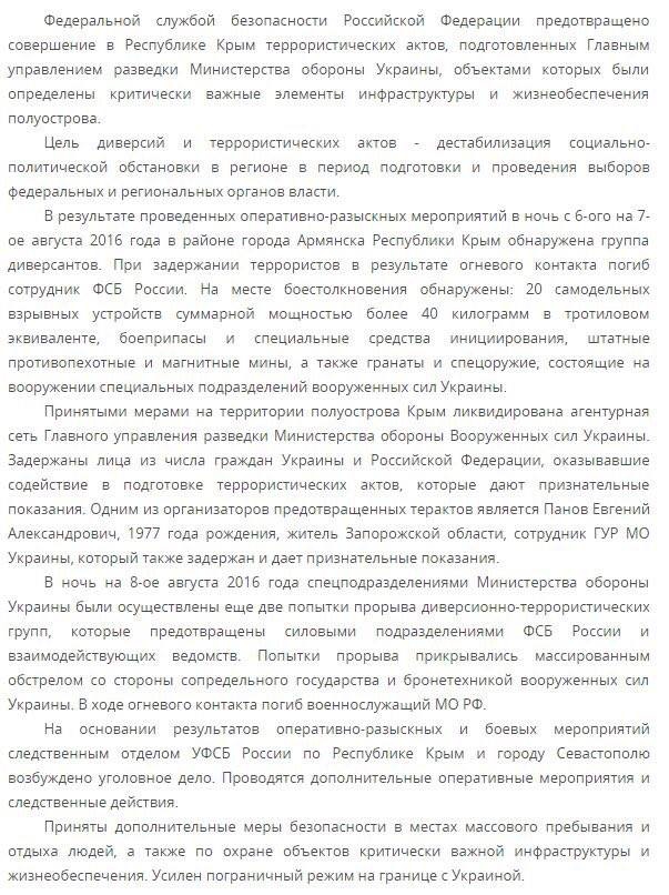 "1. УФСБ по Крыму получило информацию, что в районе Армянска находится схрон со взрывчаткой. Оперативная группа выехала на место.