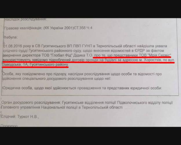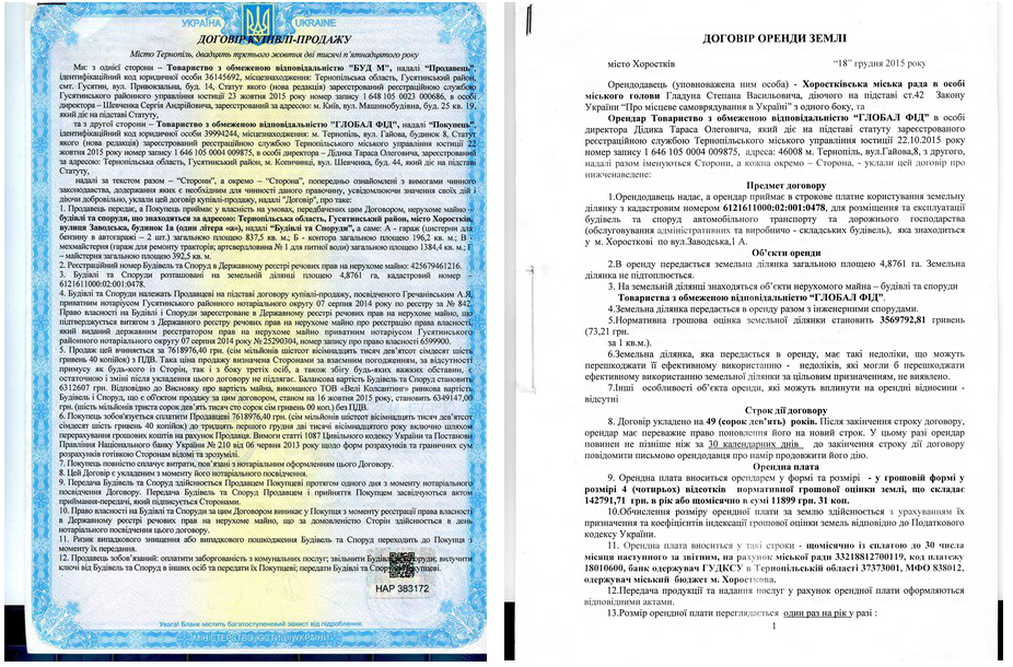 На опровержение этого директор ООО "Глобал Фид" Тарас Дидык предоставил журналистам-расследователям оригинал документа "Акт купли-продажи АТП", а также договор на аренду земельного участка (территория АТП), заключенный с Хоростковским городским советом еще в 2015 году, сроком на 49 лет.
