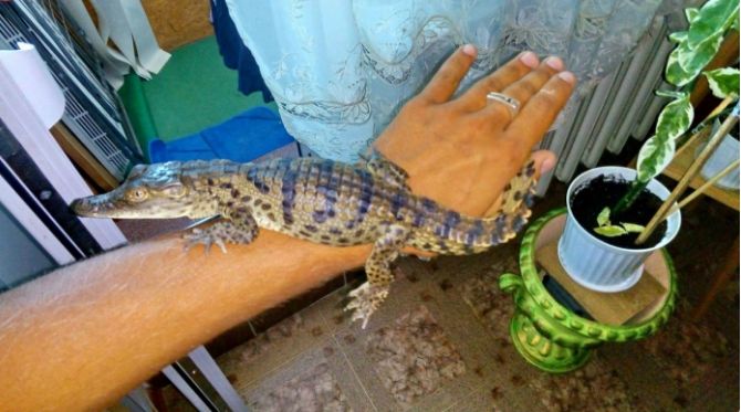 Маленький крокодил находился в траве и оказался ручным. Молодой человек, который его нашел, забрал крокодила домой, где тот провел ночь в аквариуме. Свою «находку» житель Одесской области накормил свининой. Позже нашелся хозяин крокодила — фотограф, который работает на пляже в курортной Затоке.