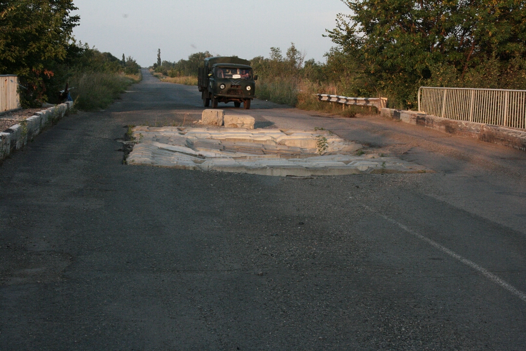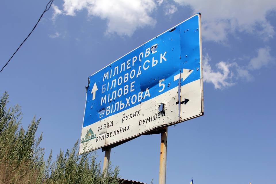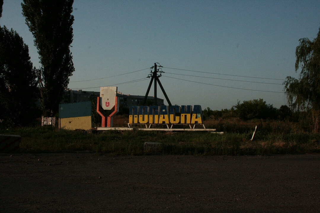 В Попасную мы заехали ненадолго, пополнить запасы продуктов в дорогу в местном супермаркете. Но две вещи поразить нас успели. Прямо на въезде в город есть старый мост через железную дорогу. Прямо посреди моста дыра, заваленная железобетонными шпалами и балками. Говорят разное, одни говорят о попавшем снаряде, другие о том, что там провалился БТР, но в любом случае зрелище впечатляющее и напоминающее о войне. В самой Попасной на первый взгляд ничего не говорит об обстрелах и боях. Только стоит присмотреться, и начинаешь замечать пустые здания, простреленные или посеченные осколками фасады и дорожные знаки. Выгоревшие деревянные окна, ободранные фасады красноречиво, лучше многих людей расскажут о том, что здесь было и какой крови стоит противостояние на Донбассе.