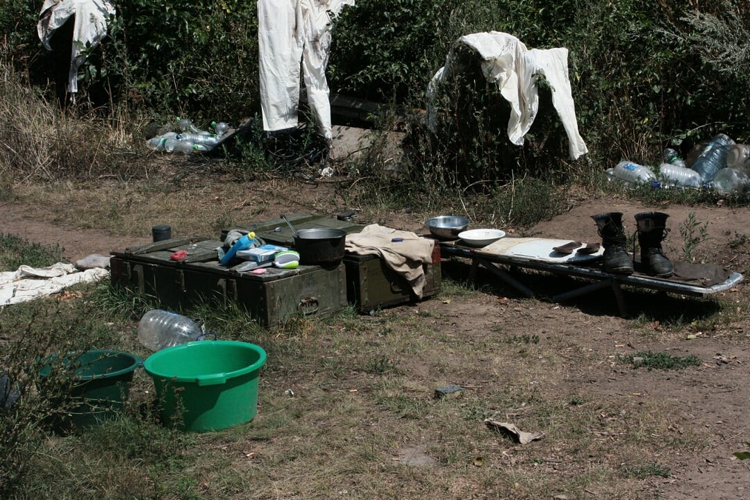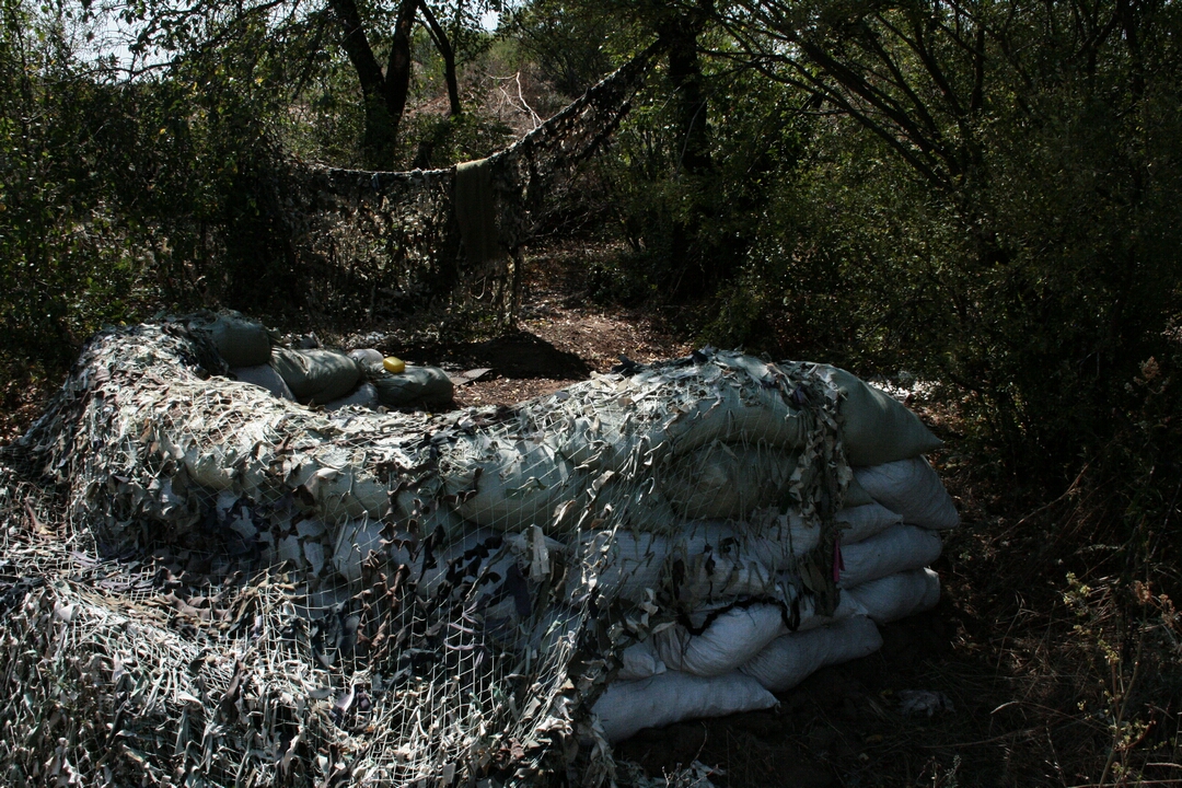 На передовой в окопах встречаемся с самыми разными людьми. Здесь и обозленные на жару и "сепаров" молодые ребята и более мудрые мужики за сорок. Возле "Лешиного хутора" к нам выходит высокий и практически не теряющий чувство юмора "Востоку". Такой позывной ему дали за его происхождение из Луганской области. Увидев журналистов, он с удовольствием показывает свои владения в окопах. Об этих отрытых в каменистой почве траншеях, блиндажах стоило бы написать отдельный репортаж, о том, как их рыли под огнем противника, как отстреливались от наступающих сепаратистов и продолжали окапываться. Но нас тогда там не было. Только увидев, что сделано руками этих парней, начинаешь понимать, почему они не покинут свои рубежи. К "Восходу" присоединяется мужчина постарше. Знакомимся.