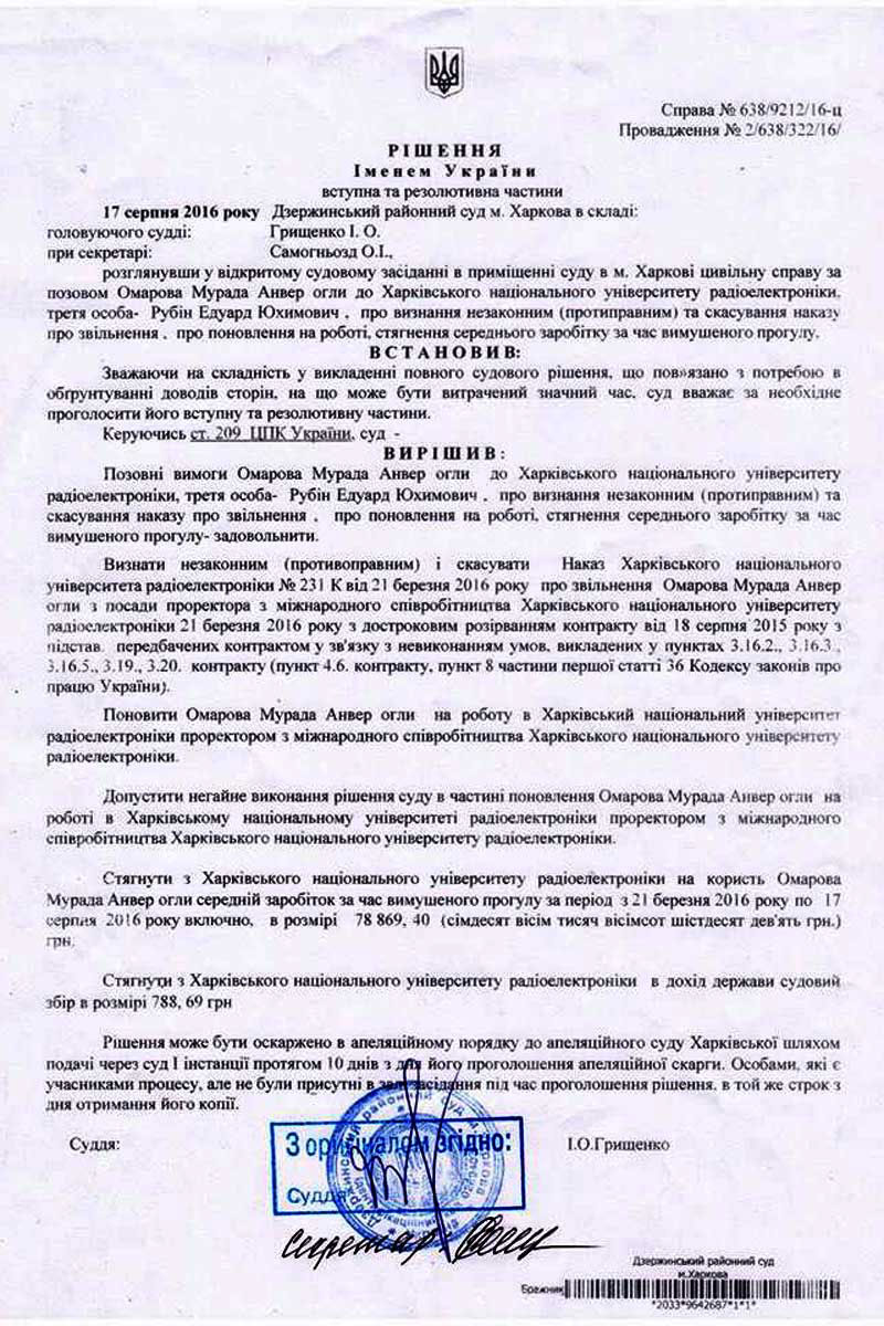 Дзержинский районный суд Харькова 17 августа вынес решение о признании незаконным увольнения проректора по международному сотрудничеству Харьковского национального университета радиоэлектроники (ХНУРЭ) Мурада Омарова. Об этом сообщила адвокат Ирина Хижняк на своей странице в Facebook. Омаров был уволен по приказу и.о ректора ХНУРЭ Эдуарда Рубина от 21 марта.