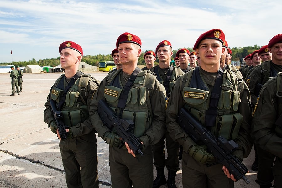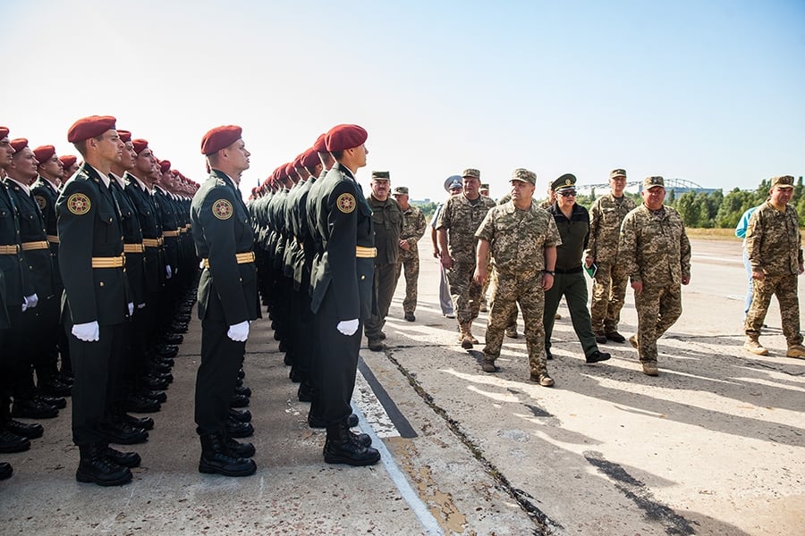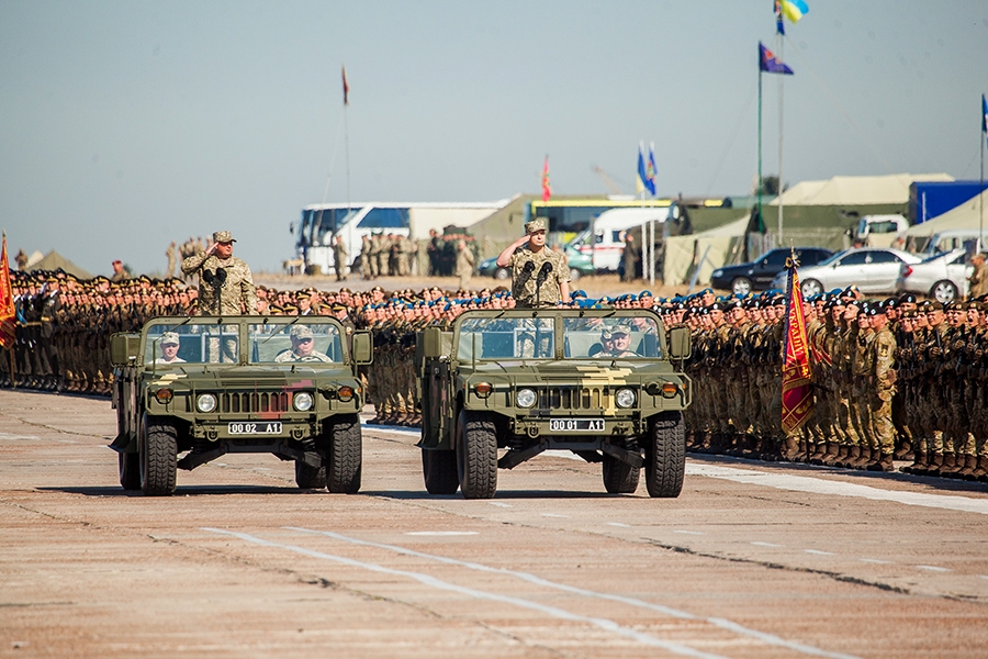 Во время репетиции командующий Национальной гвардии Украины генерал-лейтенант Юрий Аллеров вместе с Министром обороны Украины генералом армии Украины Степаном Полторак провел строевой смотр личного состава гвардии.