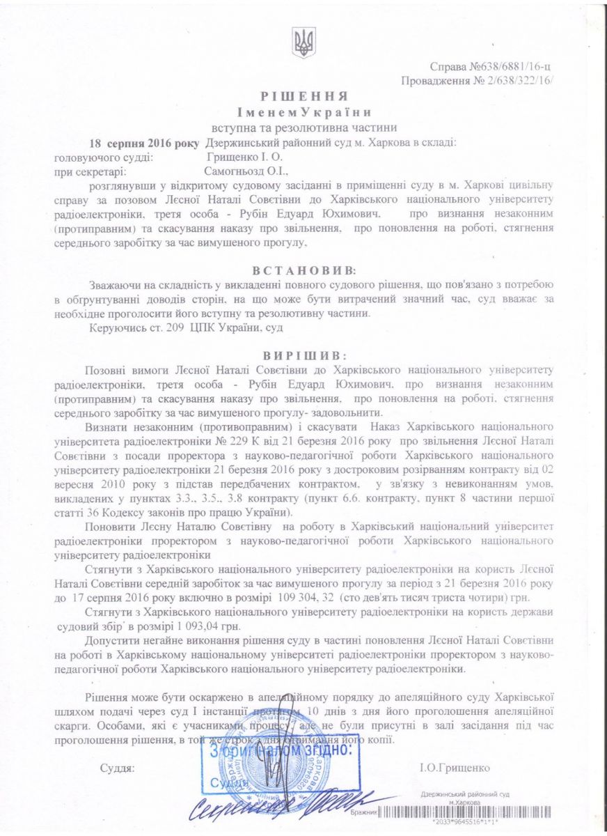 По ее словам, после того как решение вступит в законную силу в пользу Лесной со стороны ХНУРЭ будет взыскан средний заработок за время вынужденного прогула в сумме 109 304, 32 грн.