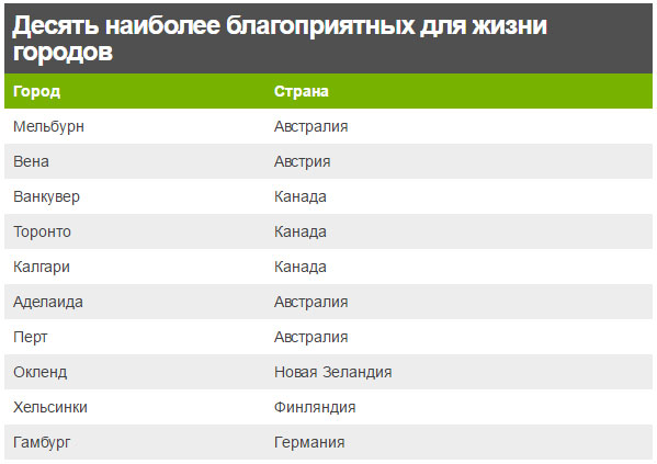 Наиболее благоприятным для жизни городом вновь был назван австралийский Мельбурн, за ним с небольшим отрывом следуют австрийская Вена, а также Ванкувер и Торонто в Канаде. Замыкает десятку немецкий Гамбург.