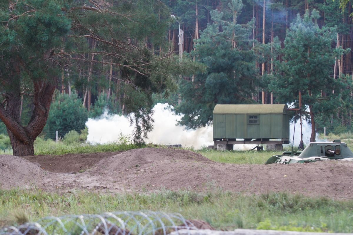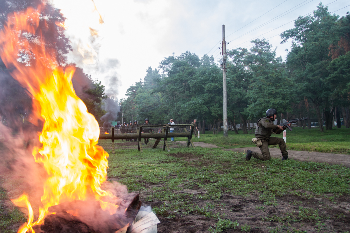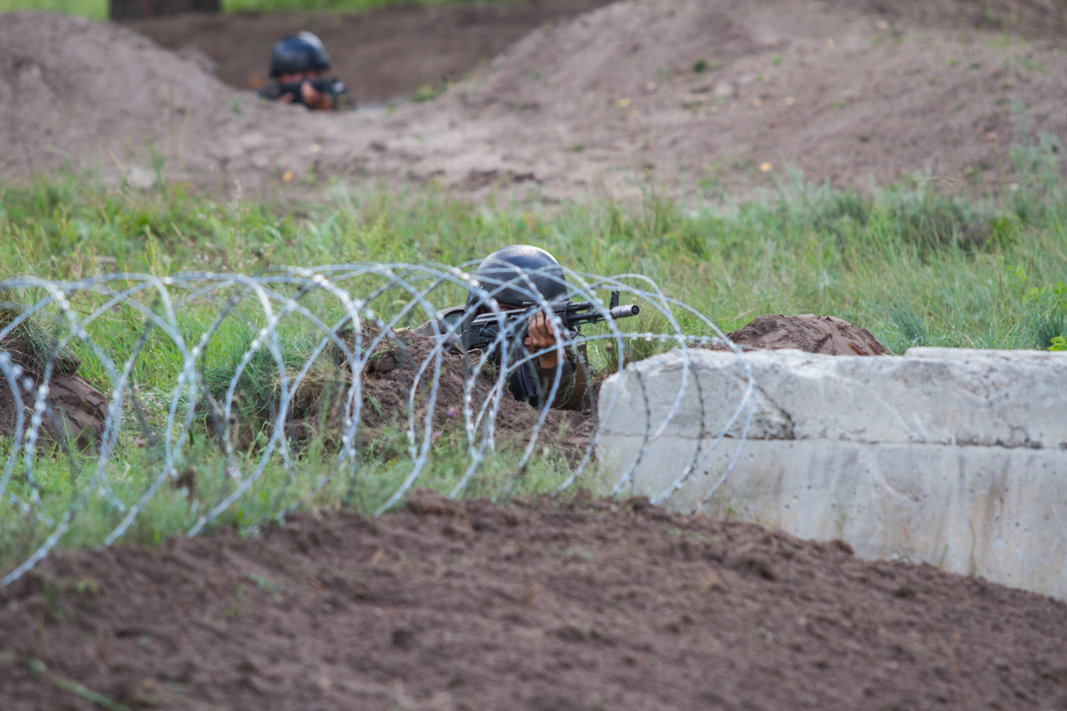 На учебном блокпосту курсанты показали, как правильно проверять транспортные средства гражданского населения. Четкую слаженность действий проявили гвардейцы, отражая нападение. Чтобы избежать артобстрела, имитируемого взрывчатыми пакетами, военнослужащие четко и организованно переместились в безопасное укрытие.