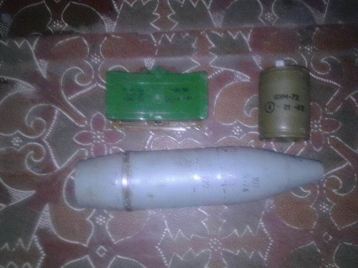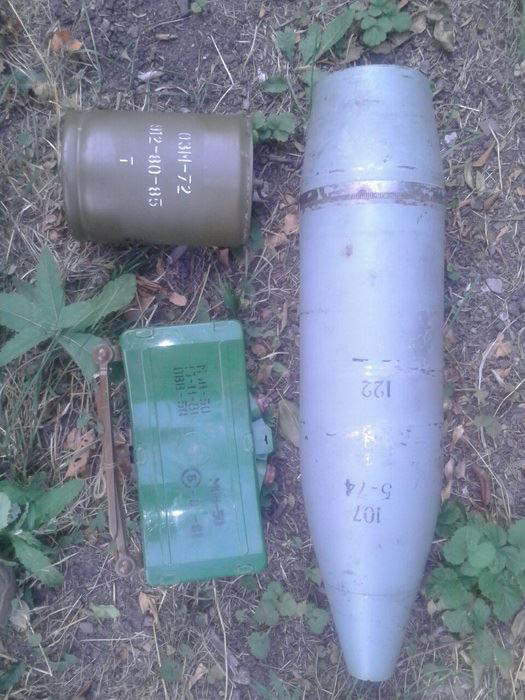 Схрон с осколочно-фугасным снарядом калибра 122 мм, противопехотной миной МОН-50 и осколочной противопехотной выпрыгивающей миной ОЗМ-72 обнаружила Служба безопасности Украины вблизи Широкино Донецкой области.