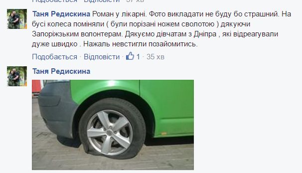 Бандити порізали колеса в бусі, яким їхали додому капелан та наші друзі, і завдали їм тяжких побоїв. Особливо постраждав Роман, який ходить з палицею, тому не міг швидко відреагувати на напад.