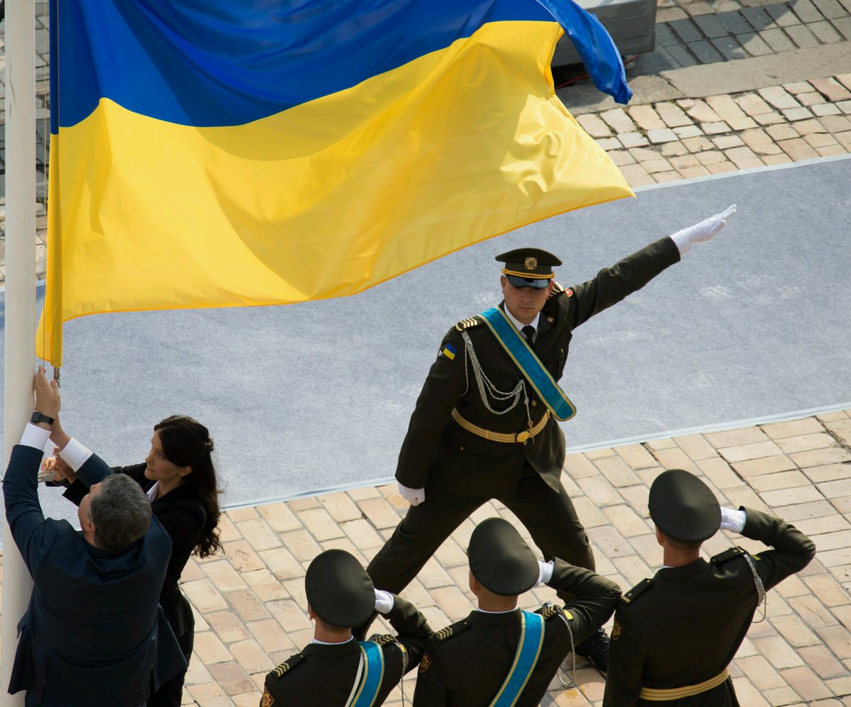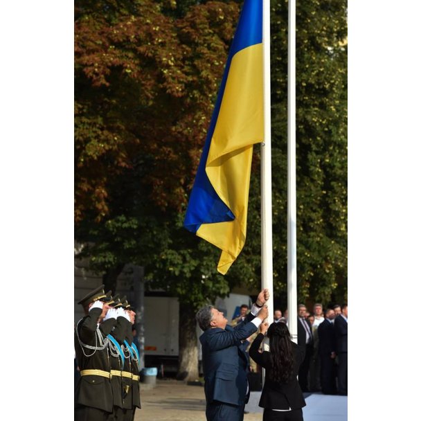 На Софийской площади в Киеве президент Украины Петр Порошенко принял участие в церемонии поднятия Государственного флага.