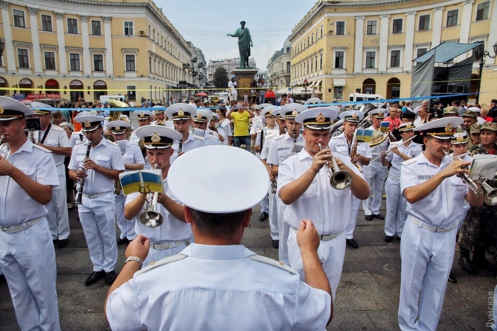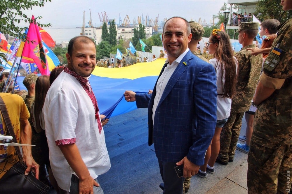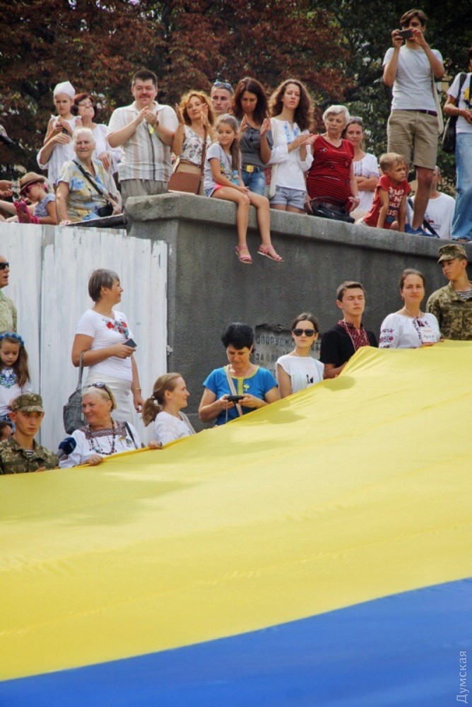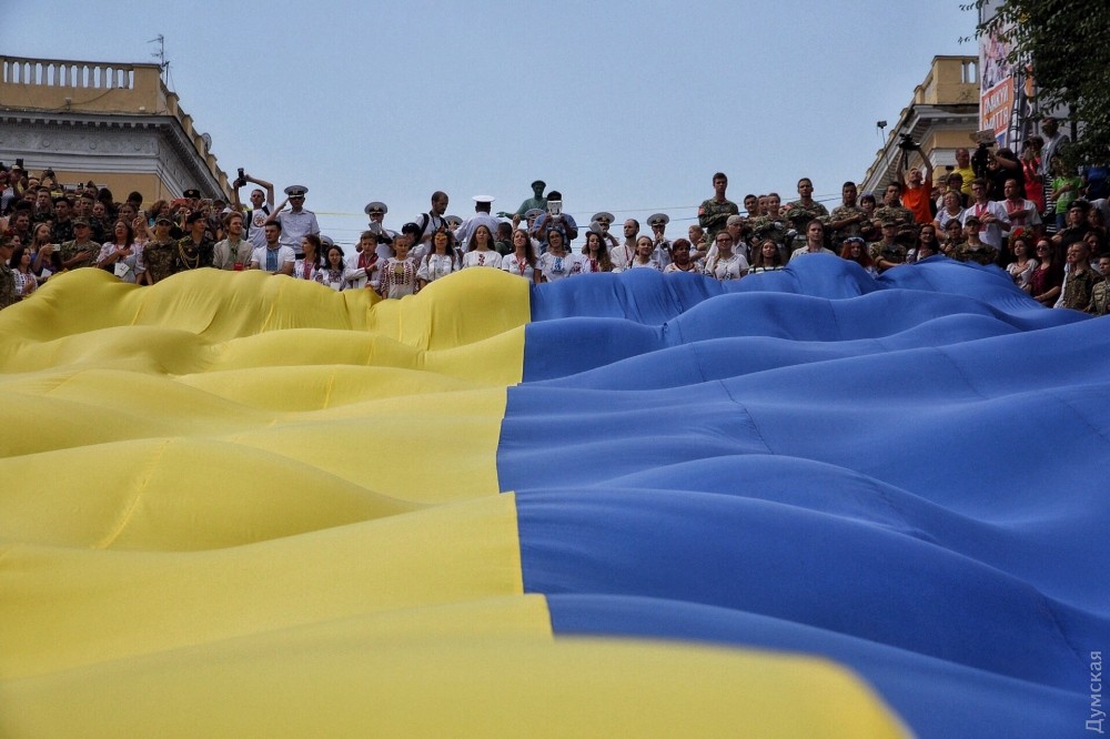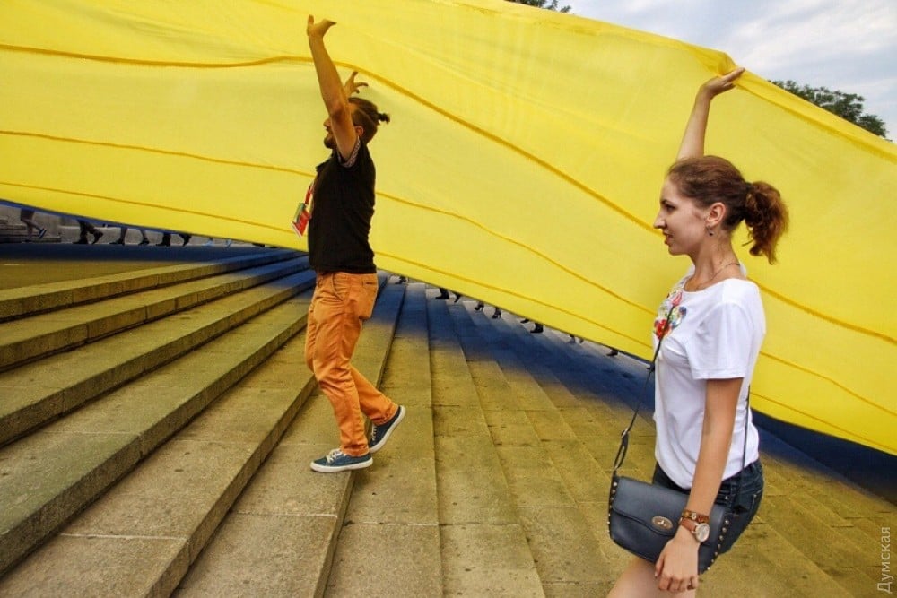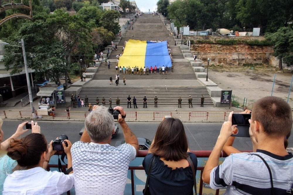 Сегодня, в День государственного флага, по уже сложившейся традиции на Потемкинской лестнице развернули огромный желто-голубой стяг.