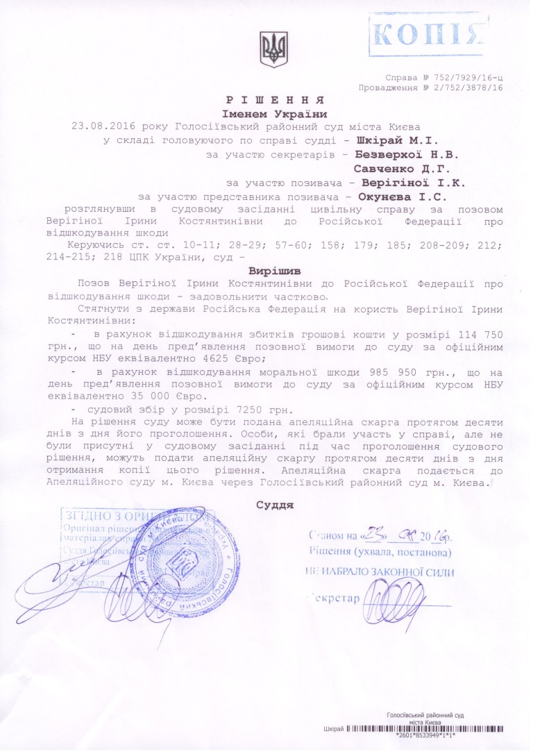 После этого женщина обратилась в суд с требованием взыскать с РФ моральный ущерб. В результате решением от 23 августа суд постановил взыскать с России в счет морального ущерба 985 950 гривен, а также убытки в размере 114 750 гривен и судебный сбор.