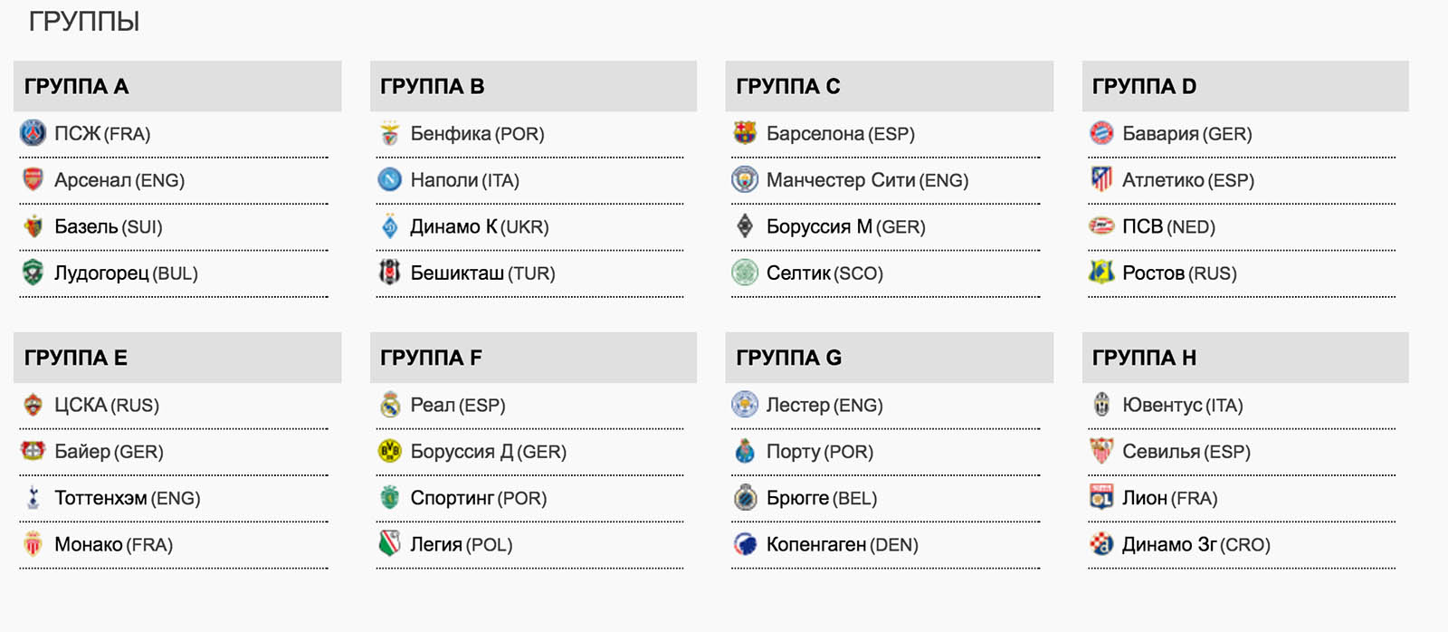 ЛЧ: "Динамо" сыграет против "Бенфики", "Наполи" и "Бешикташа" 25 августа 2016 19:49 В офисе УЕФА прошла жеребьевка группового турнира Лиги чемпионов. По ее итогам киевское "Динамо" попало в группу B, где встретится с "Бенфикой", "Наполи" и "Бешикташем". Результаты жеребьевки: