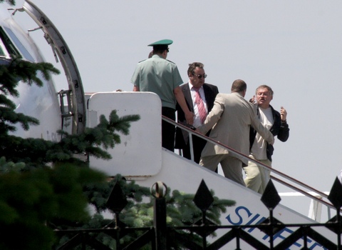 2. Украина. Симферополь. 6 июня 2009 г. Депутат Государственной думы РФ Константин Затулин (справа) во время инцидента в аэропорту города, где работники погранслужбы и службы безопасности Украины отказались выпускать его из самолета. Алексей Павлишак/ТАСС