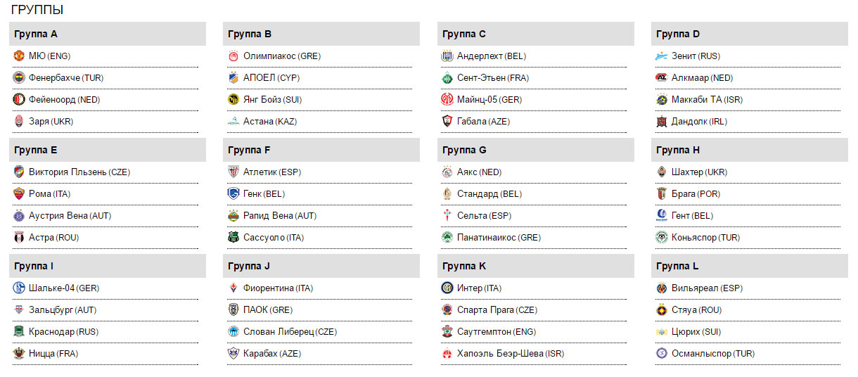 Другой украинский клуб - "Заря" – в группе A сыграет с "Манчестер Юнайтед" (Англия), "Фенербахче" (Турция) и "Фейеноордом" (Нидерланды)